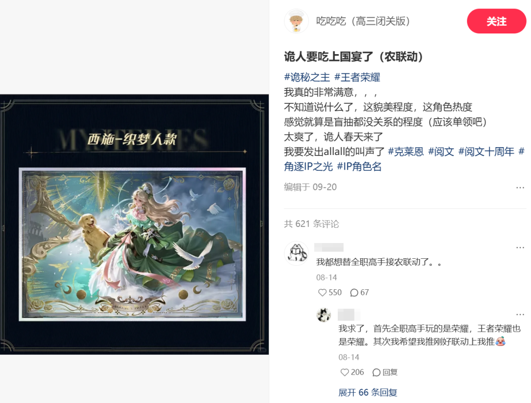 图源小红书:被禁言版《王者荣耀》在谷圈的布局,同样影响其联名活动,今年游戏内曾推出《诡秘之主》联动皮肤,高度还原了原作要素,随后官方还进行了联动周边售卖,在社媒讨论中,其柄图与谷子设计得到了不少《诡秘之主》粉丝的称赞。