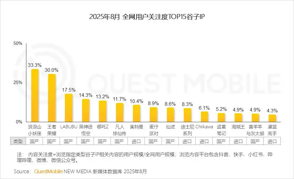 首先最能直观体现角色号召力的,就是今年《王者荣耀》持续发力的谷子周边赛道。QuestMobile数据显示,今年8月,全网用户关注度Top5的谷子IP,分别为浪浪山小妖怪、王者荣耀、LABUBU、黑神话悟空、哪吒2。在谷圈,热门IP的含金量永远最高,遑论《王者荣耀》还是个常青的热门IP,因此哪怕它布局谷子是后来者,圈子的发展速度却“恐怖如斯”。