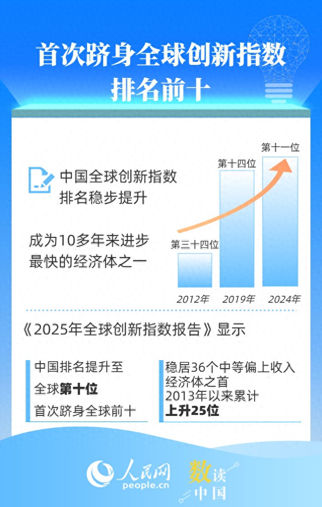 编者按:世界知识产权组织(WIPO)发布的《2025年全球创新指数报告》显示,中国排名提升至全球第10位,首次跻身全球前十;国家统计局日前发布2024年中国创新指数测算结果,2024年中国创新指数达到174.2,保持稳步增长态势。中国跑出创新“加速度”,一组数据来看。