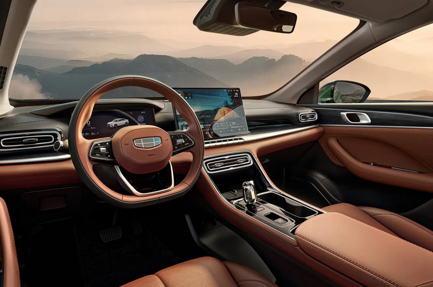 坐进第5代帝豪的车内,体验会更惊喜。新车采用环抱式座舱设计,中控向主驾倾斜8°方便操作,旷野棕、云舒灰、星夜黑三款配色适配不同用户的审美需求,80%以上区域覆盖软质材料,连中央扶手箱内部都做了植绒处理,触感细腻,再也没有从前硬邦邦的廉价感了。而且母婴级健康座舱标准的用料,也能让有孩子的家庭更放心。