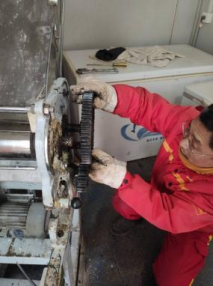 另外防喷盒中间胶皮密封部位因老化已密封不严,钻井队通过自购直角胶皮,对损坏老化部位进行更换,修复防喷盒,使其恢复了正常使用。压面机辊子轴承损坏,管理员通过自购轴承、自行拆解、更换,成功将压面机修好。