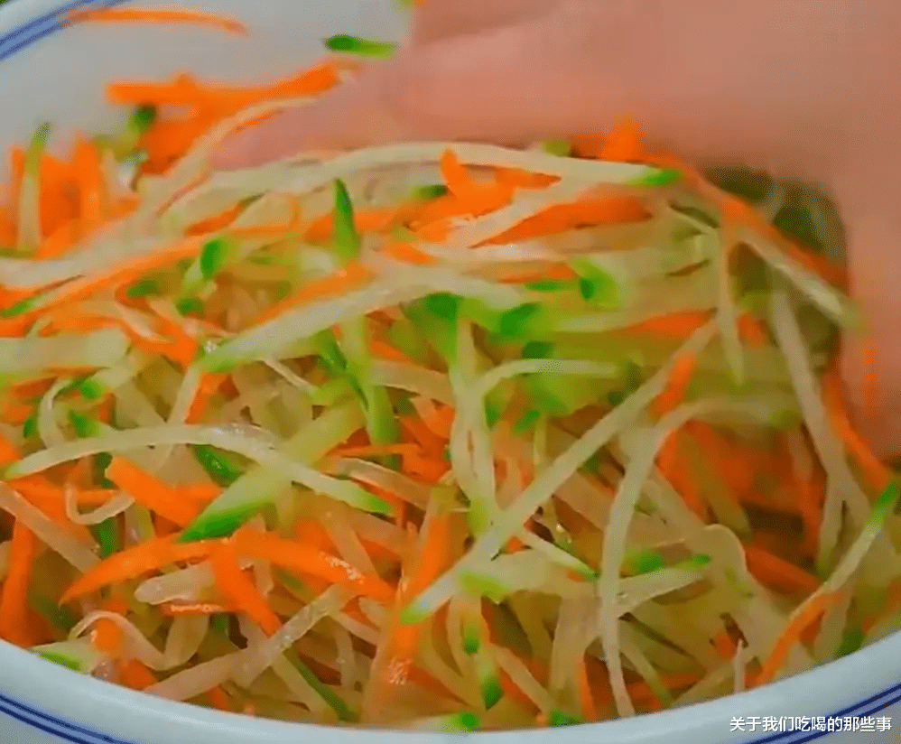 把萝卜洗净,外皮去掉,用擦丝器擦成细丝状,装进大碗。擦好了加入少许盐,下手抓拌均匀,抓到微微出水后,静置十五分钟。
