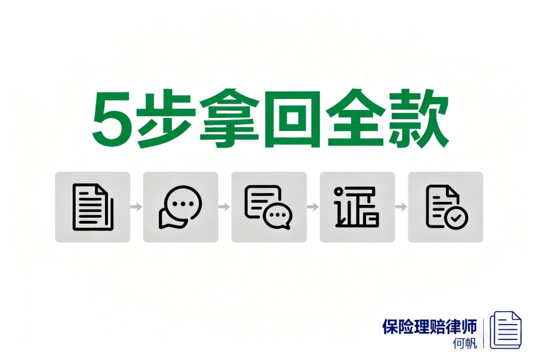 根据这些法律逻辑,我为张先生梳理出了五步维权方案,这并不是毫无依据的构想步骤,而是将具体案例与司法实践紧密结合后提炼出的可行操作路径。每一步都牢牢抓住拒赔环节中的关键问题,能够帮助你提升效率,降低试错成本。