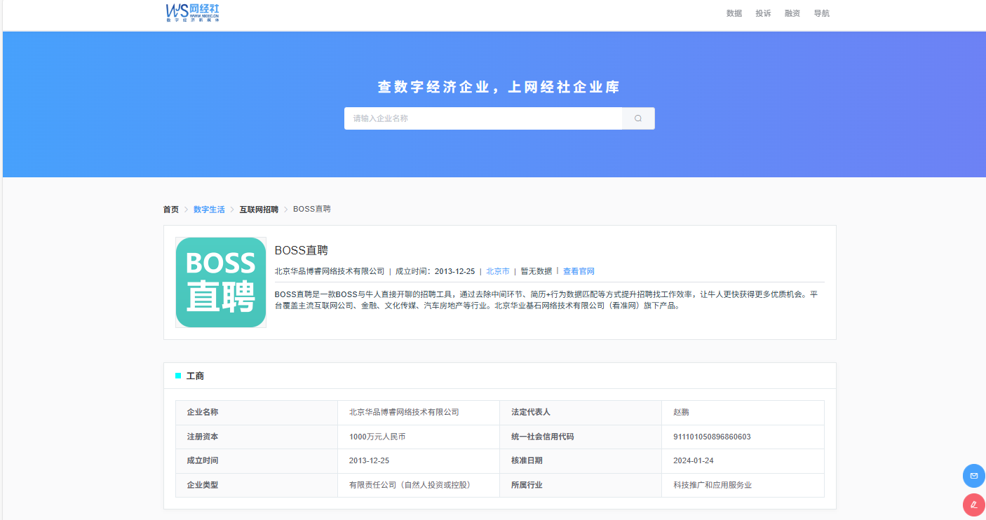 网经社企业库显示,BOSS直聘隶属于北京华品博睿网络技术有限公司,成立于2013年12月25日,位于北京市,法定代表人为赵鹏。