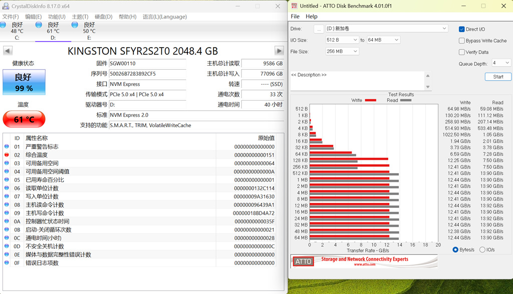 根据测试结果来看,这块G5 SSD在写入70T的数据之后,读取速度上限为14.7GB/s,写入速度上限为13.2GB/s。