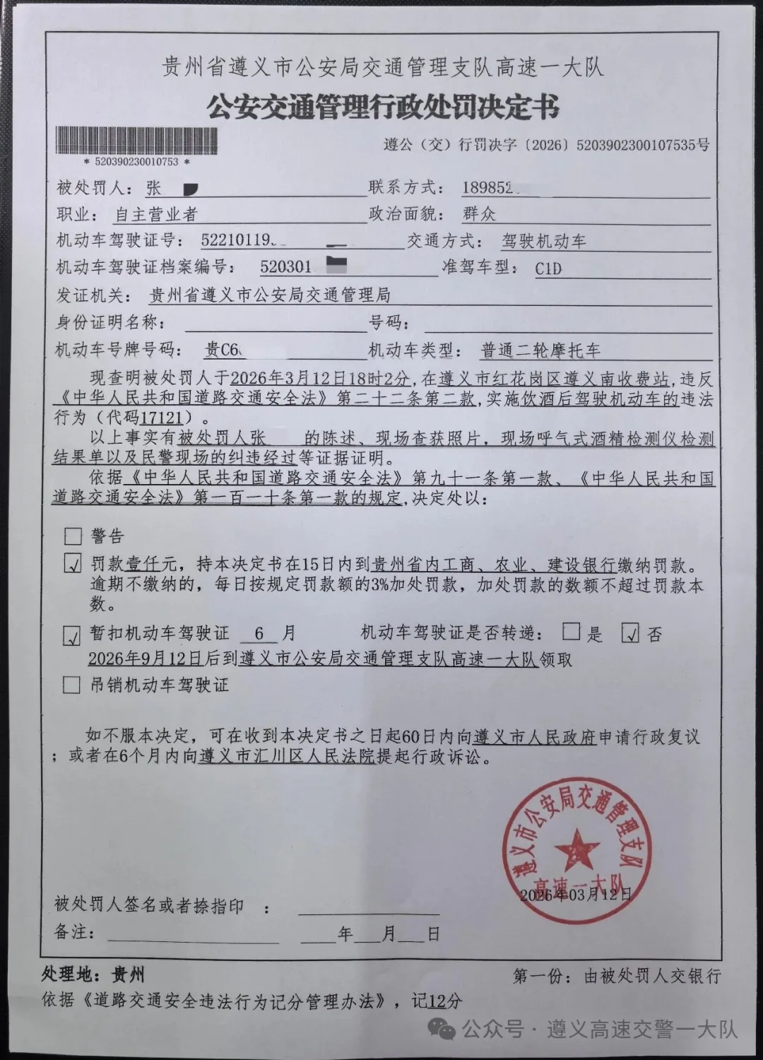 2026年3月12日18时02分许,张某驾驶贵C牌照的普通二轮摩托车行至兰海高速公路1225公里0米时,因涉嫌饮酒后驾驶机动车的违法行为,被民警当场查获。经呼气式酒精检测仪检测,张某呼出气体酒精含量结果为31mg/100ml。民警对张某饮酒后驾驶机动车的违法行为,予以扣12分,罚款1000元,暂扣驾驶证6个月的处罚。