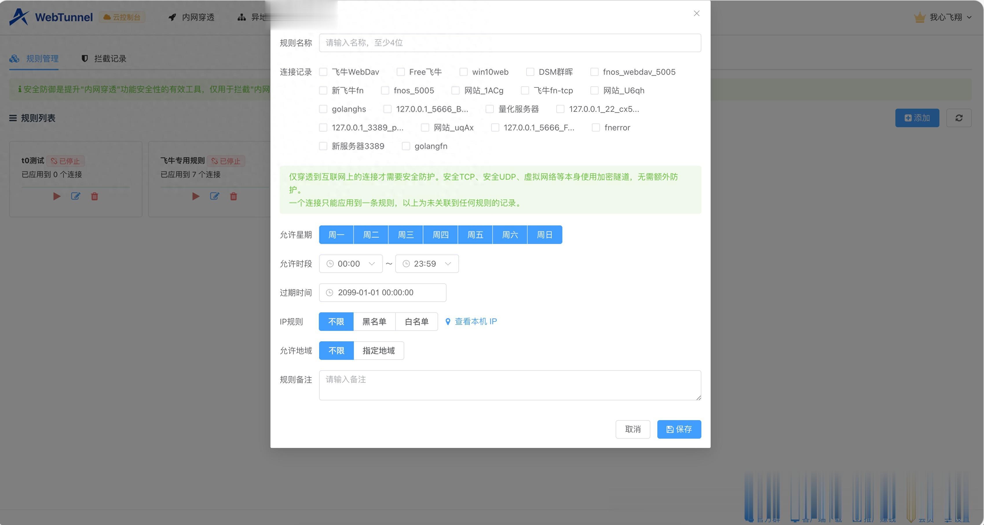 1. 时间窗口限制:只在工作日“在线”通过允许时段设置,你可以精准规定服务对外开放的时间。比如,你可以设置为周一到周五的 09:00 - 18:00 开放。 到了晚上或者周末,穿透通道会自动关闭。这时候,即便有人知道了你的访问地址,尝试连接也只会得到“连接超时”的反馈。