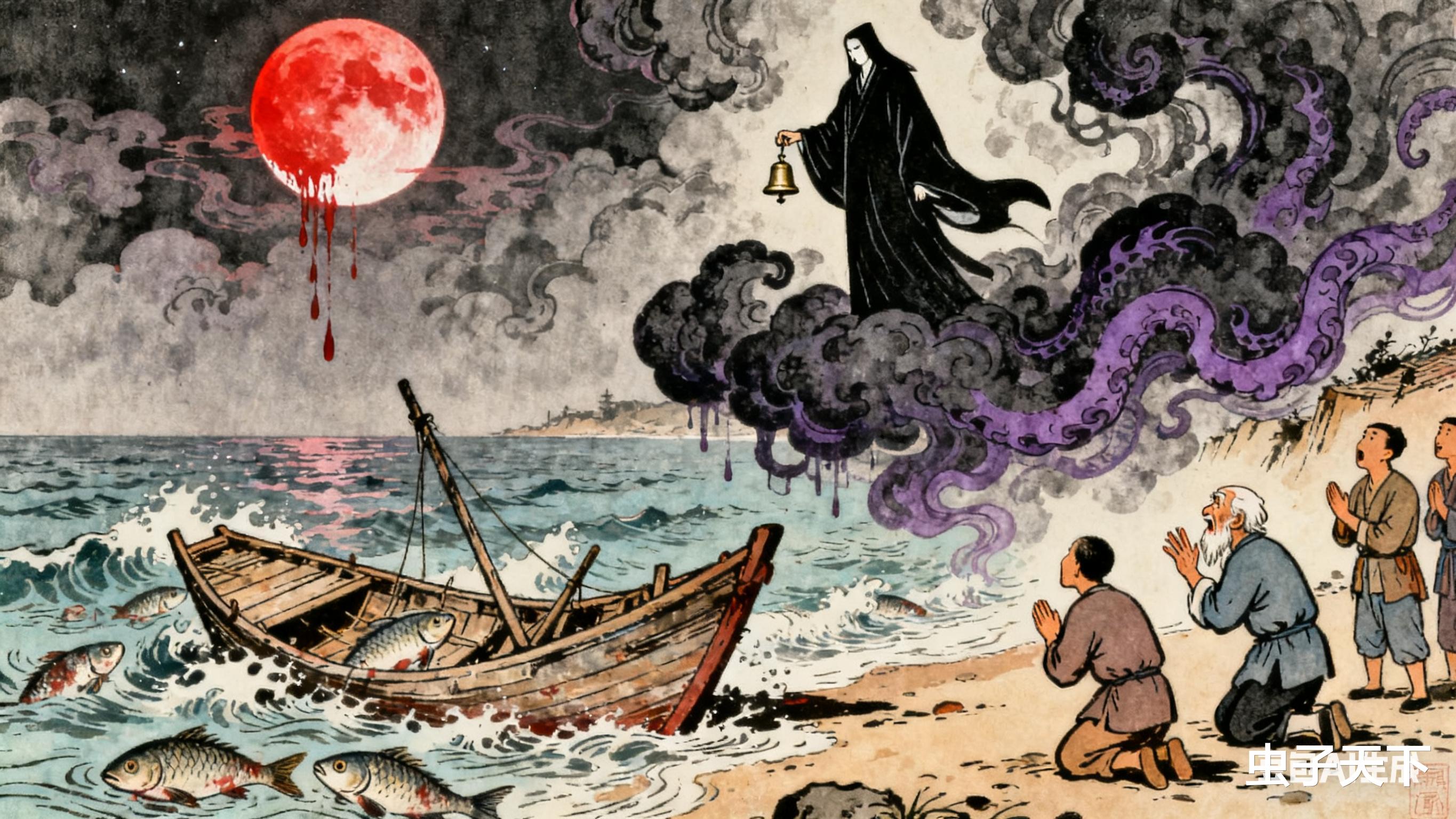 云里头,隐约有个人影,披着黑袍,脸白得吓人,手里拎个铃铛,一摇,海里就浮上来死鱼。