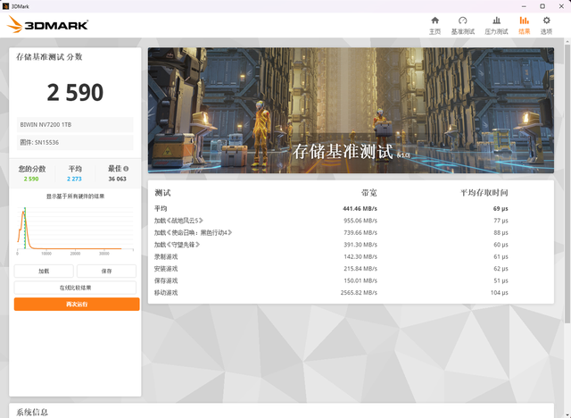 佰维NV7200以2590分总分垫底,平均带宽441.46 MB/s为最低,在《战地风云5》加载速度上,其加载速度未能突破1000 MB/s大关,与其他两款产品存在一定差距。同时在平均存取时间上对比其他两款也相对落后。