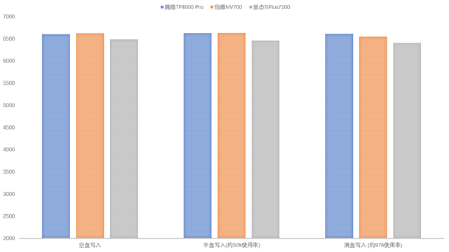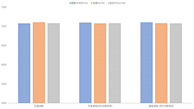 腾隐TP4000 Pro: 空盘读取约 7075 MB/s,写入约 6601 MB/s。半盘读取约 7096 MB/s,写入约 6629 MB/s。满盘读取约 7104 MB/s,写入约 6608 MB/s。整体性能表现稳定,波动极小。