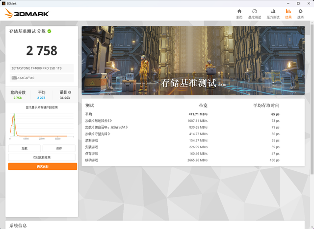 腾隐TP4000 Pro在测试中总分2758分,位居第二,游戏加载性能也不错,比如说在《战地风云5》加载速度能达到1007.11 MB/s,在移动游戏加载速度2665.26MB/s表现领先,而65μs的平均存取时间中规中矩。