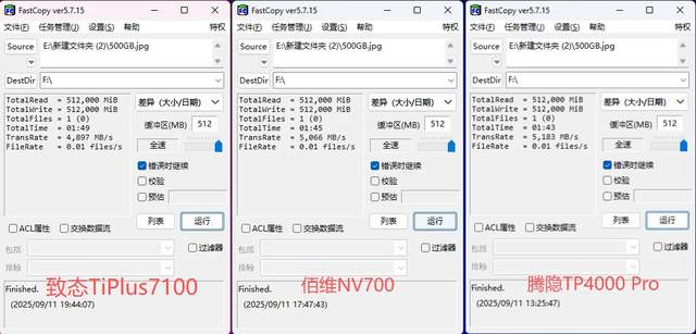 在均传输512GB单文件,缓冲区512MB的条件下,三款固态硬盘的性能表现对比如下: