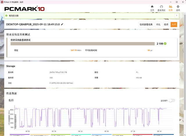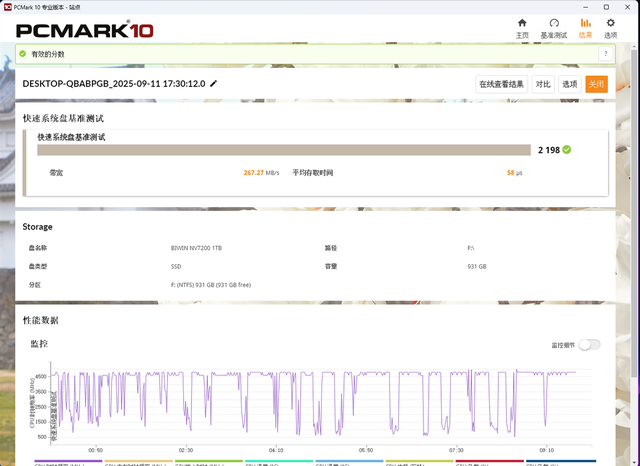 佰维NV7200(2198分) 与 致态TiPlus7100(2199分) 性能几乎持平,带宽分别为267.27 MB/s和267.70 MB/s,存取时间均为58μs,二者均落后腾隐约5%的性能差距。