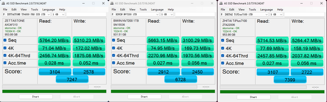 腾隐TP4000 Pro(7247分) 顺序读写速度领先(5764.20 MB/s读取,5310.23 MB/s写入),4K随机写入高达172.02 MB/s为三者最优,但4K-64Thrd写入仅1875.08 MB/s垫底;