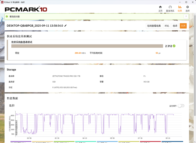 腾隐TP4000 Pro以2312分领先,带宽达280.60 MB/s且存取时间最短(55μs),展现最优的综合响应能力。