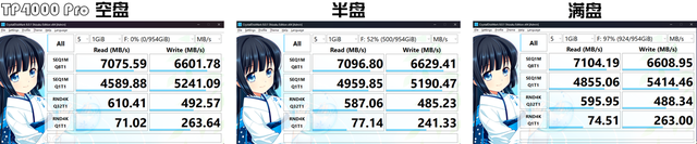 腾隐TP4000 Pro、佰维NV7200 和 致态TiPlus7100 三款 1TB PCIe 4.0 NVMe SSD 在 CrystalDiskMark 软件下的性能测试结果,重点考察顺序读写性能(SEQ1M Q8T1) 在 空盘、半盘 (约50%使用率) 和 满盘 (约97%使用率) 三种状态下的表现: