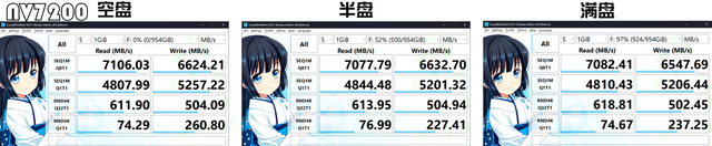 佰维NV7200: 空盘读取约7106 MB/s,写入约6624 MB/s。半盘读取约7077 MB/s,写入约6632 MB/s。满盘读取约7082 MB/s,写入约6547 MB/s。性能表现同样较为稳定,波动较小。