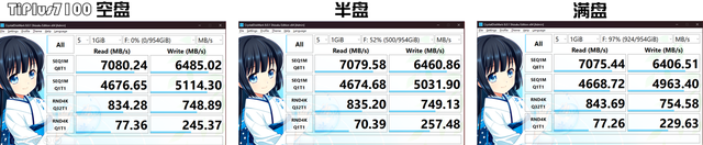 致态TiPlus7100: 空盘读取约 7080 MB/s,写入约 6485 MB/s;半盘读取约 7080 MB/s,写入约 6461 MB/s;满盘读取约 7075 MB/s,写入约 6407 MB/s。读取性能非常稳定,写入速度随容量增加有轻微递减趋势。