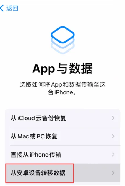 1、在新iPhone 17上:在“App与数据”界面,选择 “从Android设备转移数据”。
