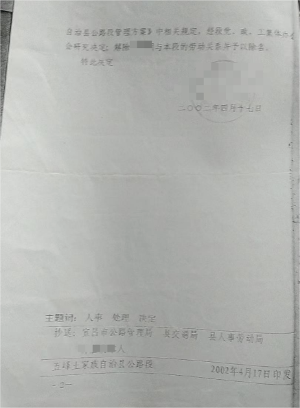 刑事判决带来了职业生涯的终结。2002年4月17日,五峰土家族自治县公路段下发《关于对帅某明的处理决定》,依据《劳动法》等相关规定,决定解除与帅某明的劳动关系并予以除名。这份决定,标志着其长达二十年的固定工生涯画上了句号。