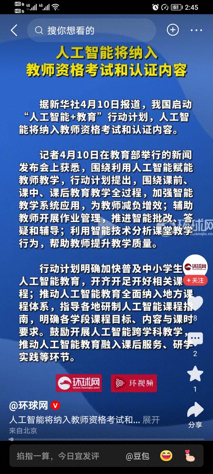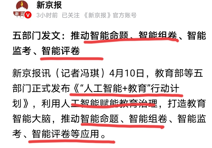 教育部等5大部门,正式发文,要在全国推行人工智能+教育行动计划,目的就是为了帮助老师们赋能,用更加轻松和有效率的工作方式,来完成教学任务,如果真正实现,这绝对是对于1800万老师们,最好的福音!