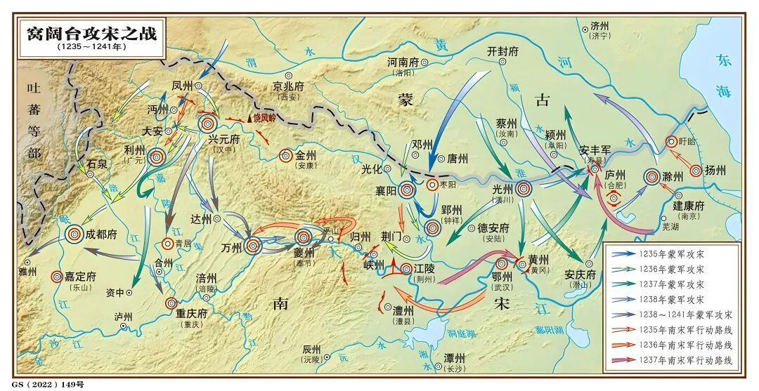 南线,蒙古军兵分三路,一路由窝阔台的次子阔端指挥,进攻四川;一路由窝阔台第三子阔出指挥,进攻京湖地区;一路由大将阿术鲁统领,进攻两淮地区。宋蒙战争全面爆发。