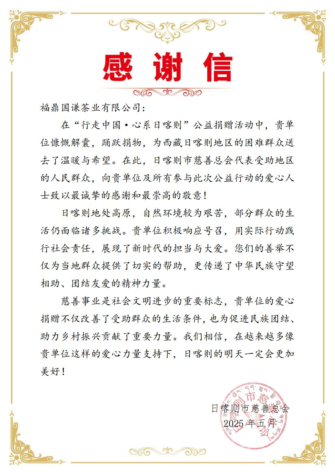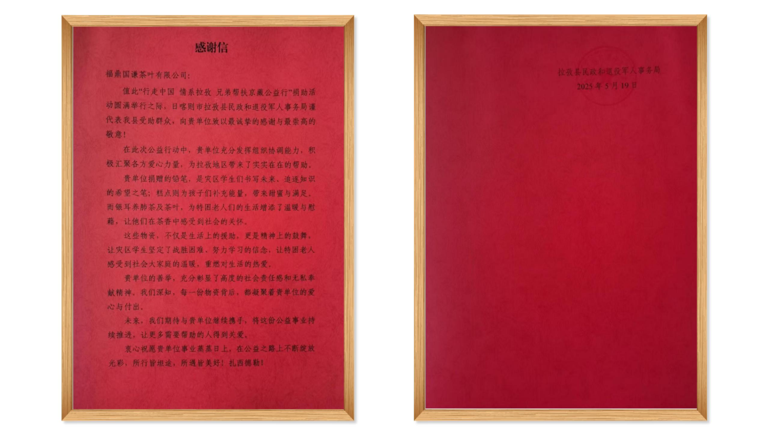 近日,福鼎国谦茶业有限公司收到了来自千里之外的西藏日喀则市慈善总会、西藏拉孜县民政和退役军人事务局的感谢信,这两份感谢信承载着藏区人民的深情厚谊,也见证了福鼎国谦茶业在公益道路上的坚实足迹。