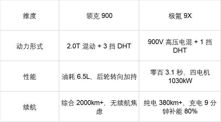 3. 智能与安全•智驾:领克 900 单 Thor 芯片主打实用(AEB 130km/h 刹停);极氪 9X 双芯片 1400TOPS 算力,支持 L3 级 “车位到车位” 领航。