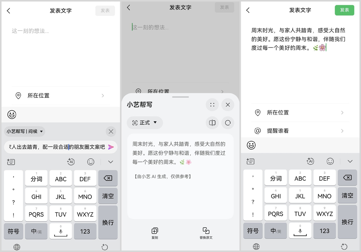 除了微信,小艺输入法也给我带来了不少便利。拍照输入功能让我在会议上能快速将PPT或纸质资料上的文字识别出来,直接粘贴发送,大大提高了工作效率。小艺帮写功能更是贴心,无论是发朋友圈、写节日祝福还是工作群公告,只需给出几个关键词,它就能生成贴合场景的文案,为我节省了不少时间和精力。