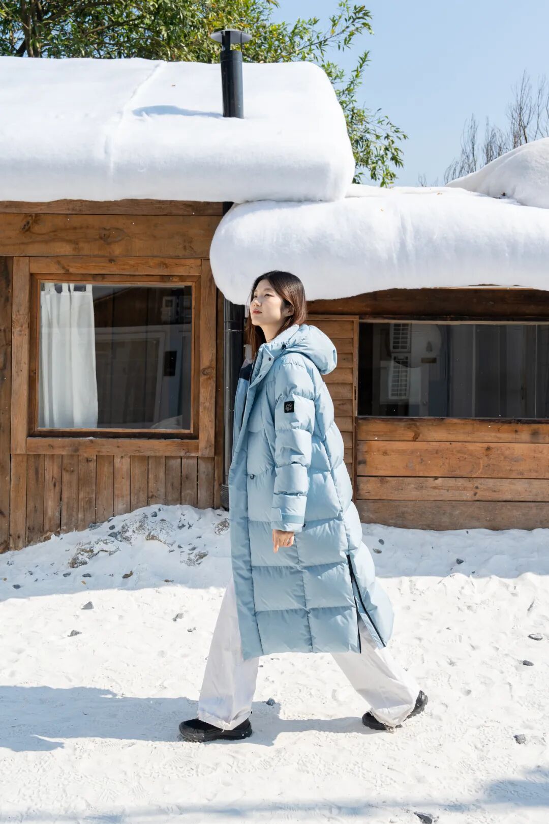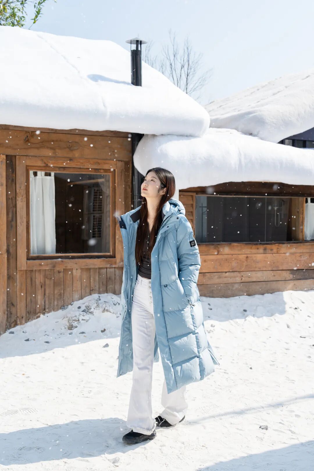 浅色系的羽绒服既能营造纯净清新的感觉,又能与白色雪景更好的融合,像浅蓝色等既保暖又上镜的颜色便是一个不错的选择。