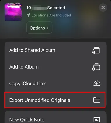 打开“照片”应用,点击“选择”以选择要传输的图片。点击“分享”图标,然后选择“导出未修改的原始图片”。
