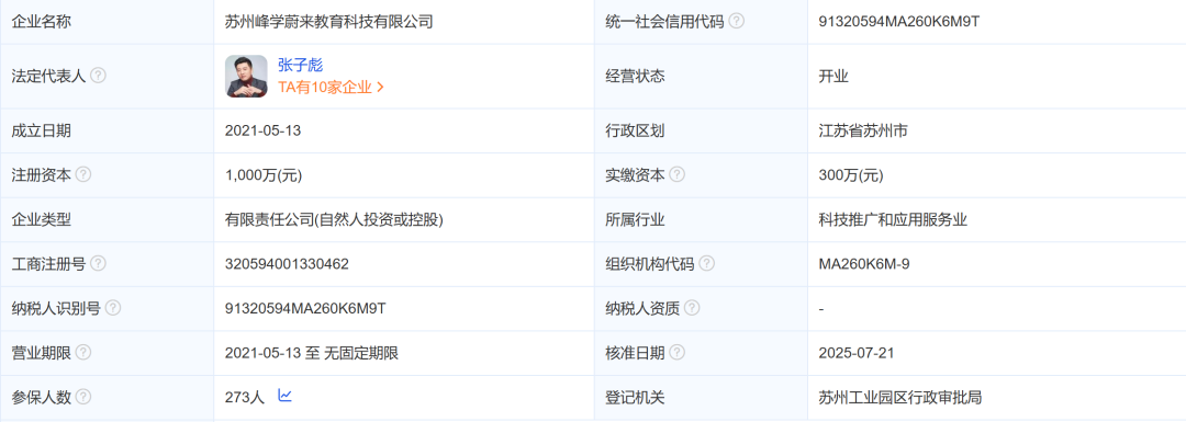 2021年,张雪峰离开了曾深度绑定的上市公司研途教育,南下苏州,创立了属于自己的公司——苏州峰学蔚来教育科技有限公司。