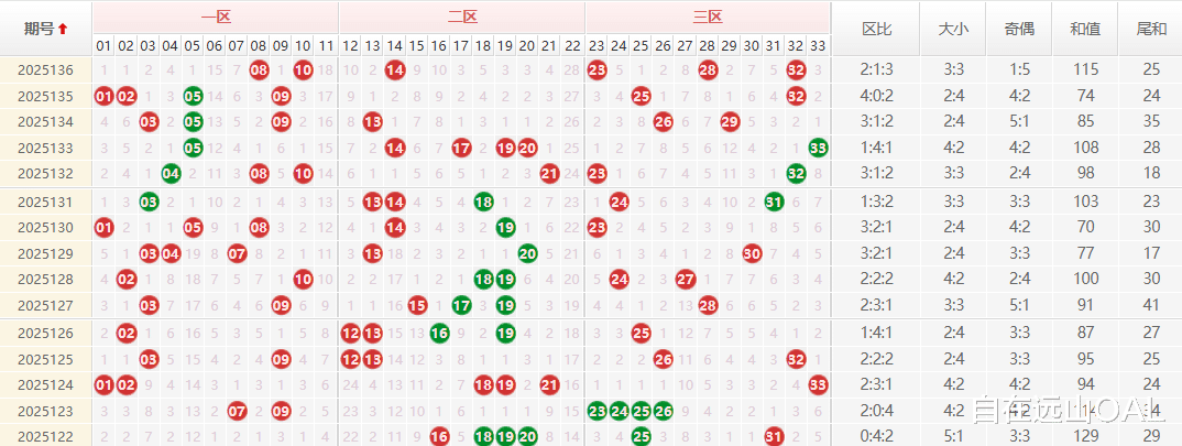 一、136期开奖深度解析:格局与热力的碰撞区间分布:3区持续爆发。红球三区比为2:1:3,3区(23-33)再次贡献3枚号码,延续了近25期42%的高占比趋势。值得注意的是,23、28、32均为近期热号,其中32已是近5期内第4次现身,热号集群效应显著。