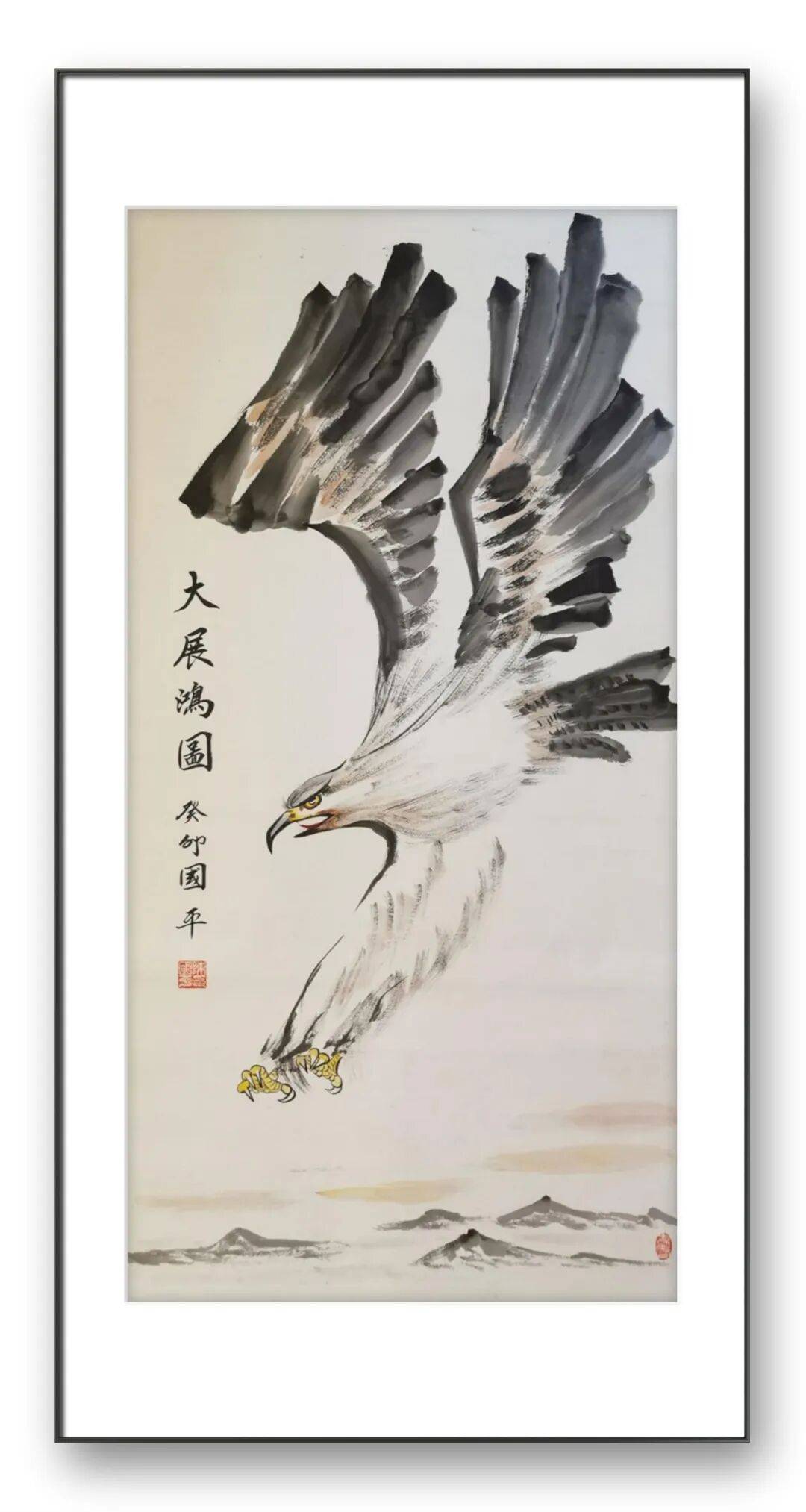 在花鸟画领域,陈国平老师善于捕捉花鸟的瞬间神态。在描绘鹰时,他不仅注重外形的塑造,更着力于内在精神的传达。在《大展鸿图》中,鹰的眼神锐利而坚定,透露出一种王者的霸气与自信,仿佛在凝视着远方的猎物,这种对神态的精准把握,源于陈老师对鹰的细致观察与深刻理解。同时,他在构图上也颇费心思,将鹰置于画面的黄金分割点附近,使鹰成为视觉焦点,而背景的简洁处理,更是突出了鹰的主体地位,让观者的目光瞬间被吸引。