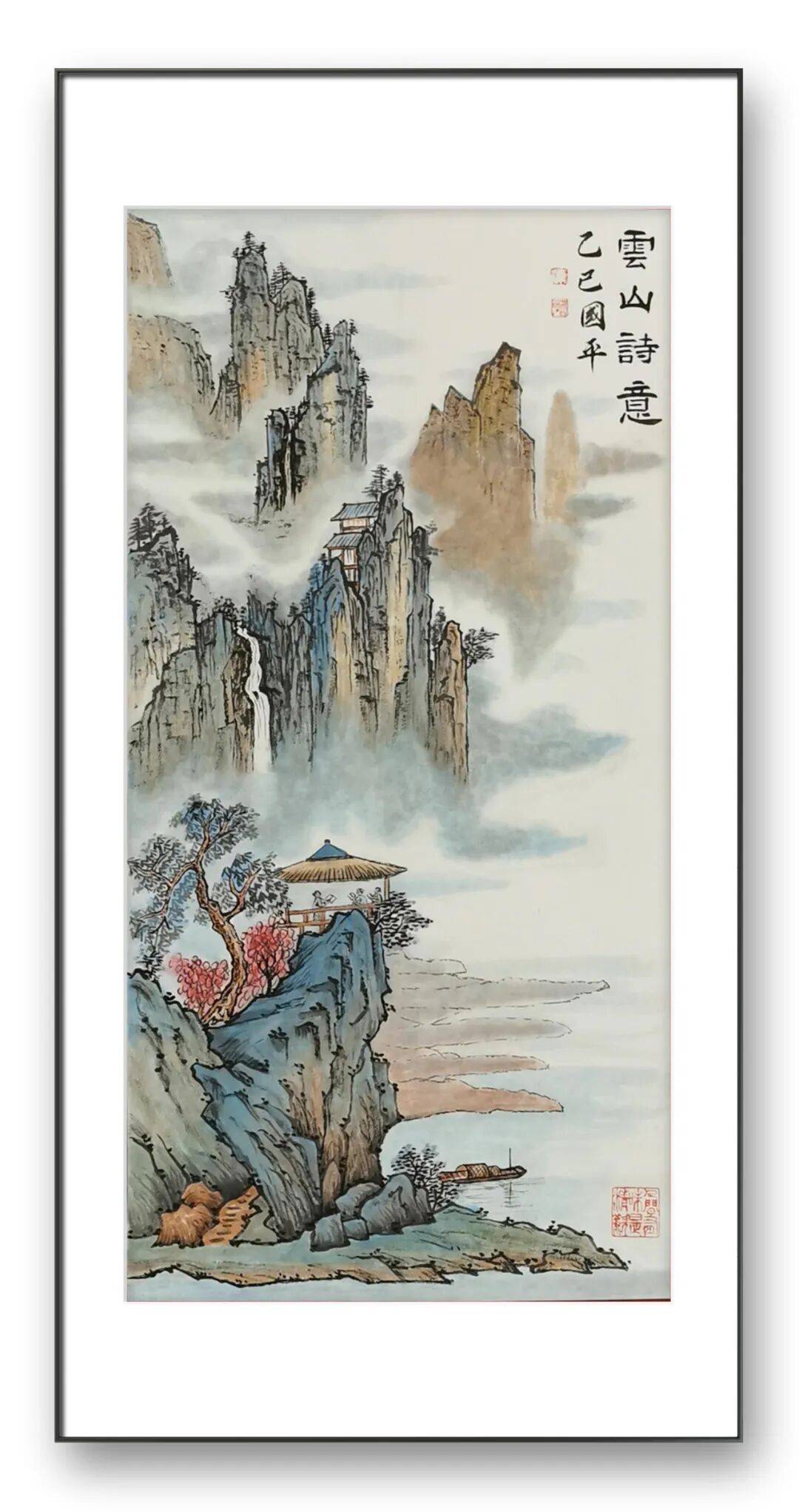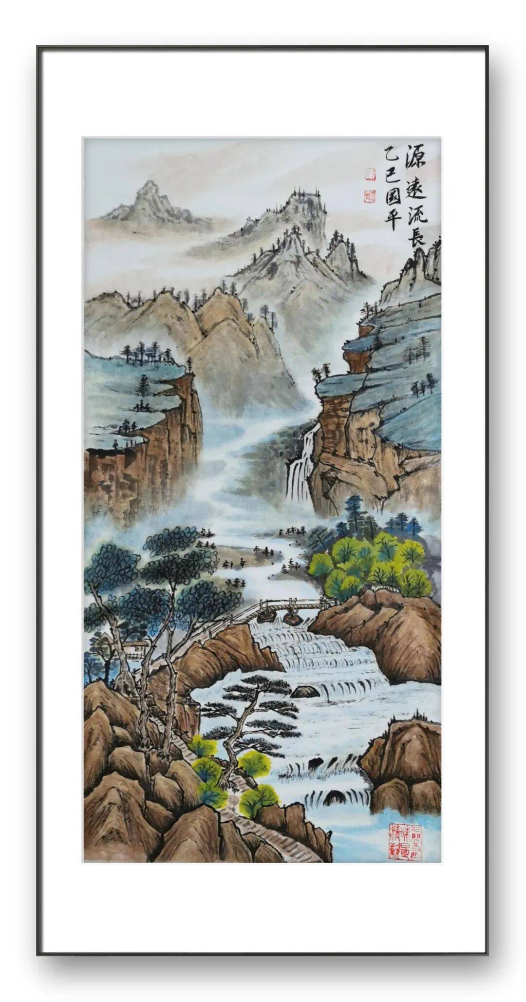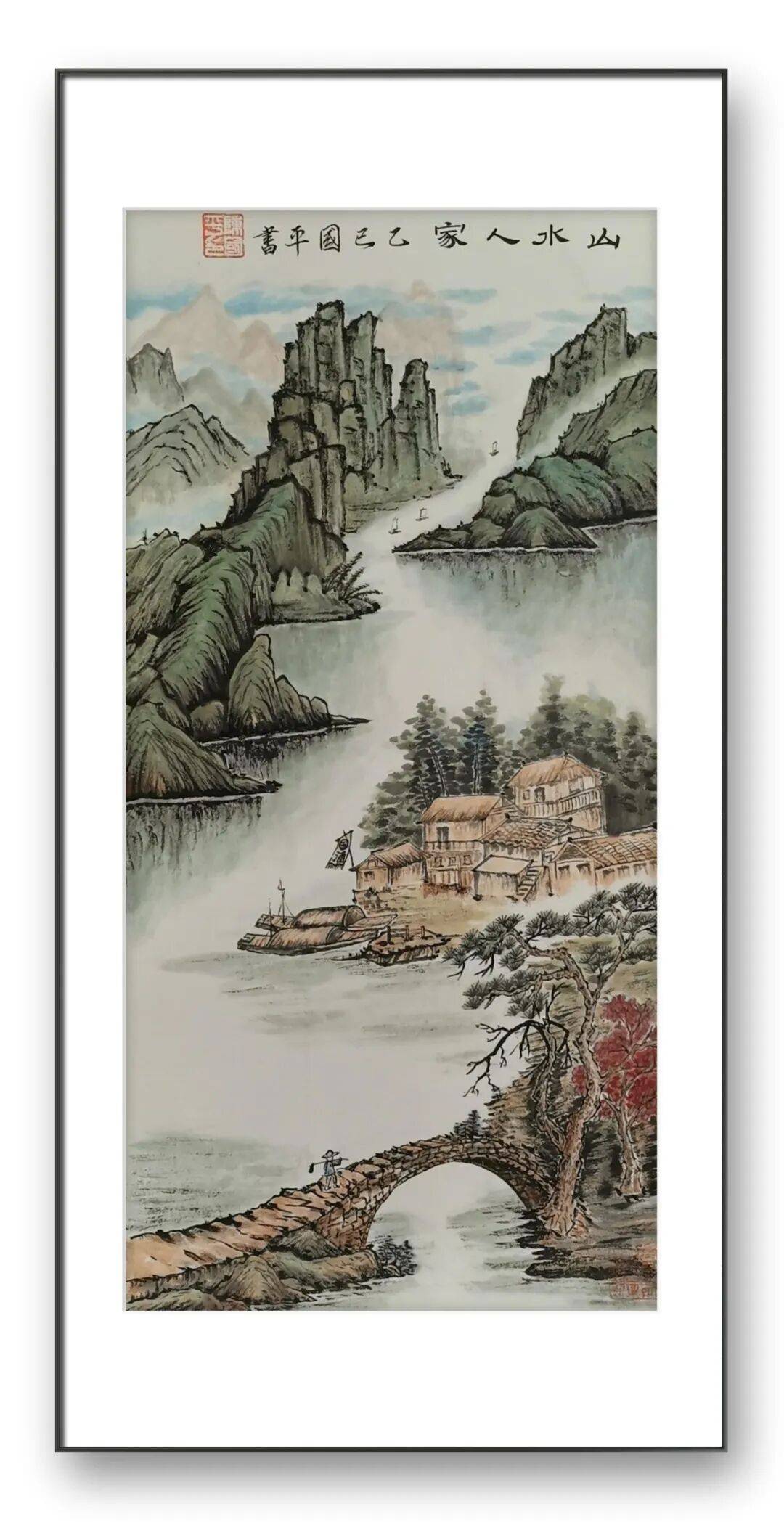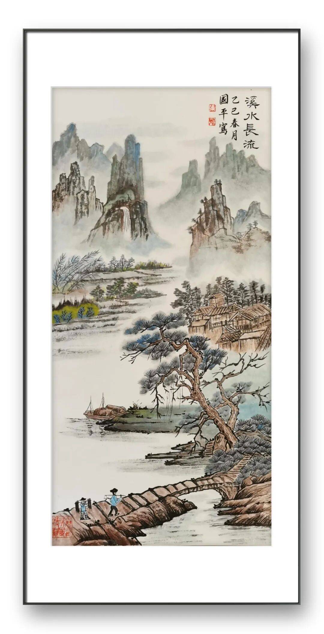 画面中,小桥流水、人家村落错落有致,人物的点缀为画面增添了生活气息。陈国平老师以淡雅的笔墨勾勒出山水的轮廓,以细腻的笔触描绘出水面的波纹和岸边的草木,将江南山水的灵秀与静谧表现得恰到好处,流露出对自然山水的热爱和对田园生活的向往之情。