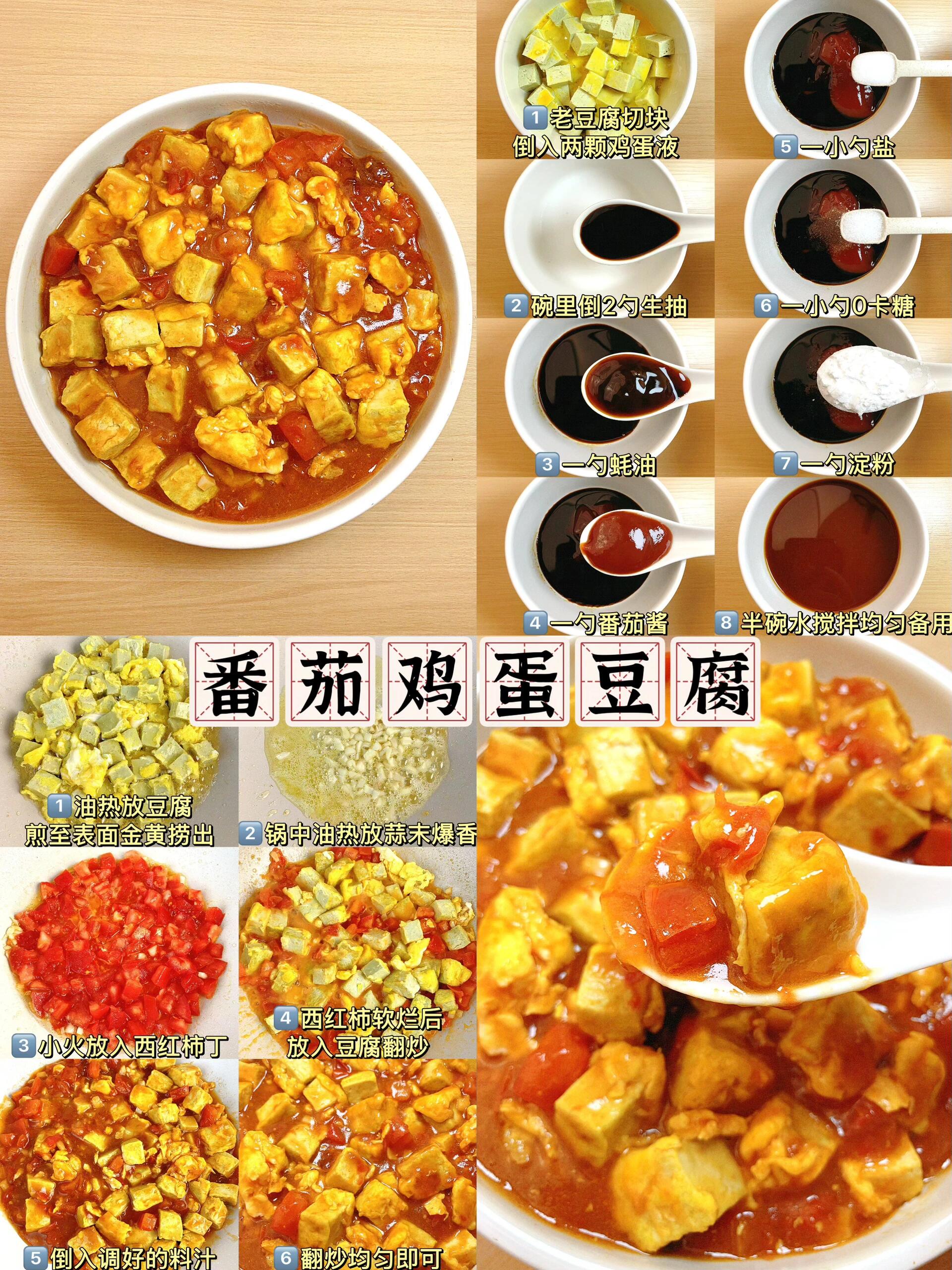 分 1-2 次倒入水淀粉,边倒边翻炒,使汤汁逐渐浓稠,包裹住豆腐和鸡蛋块。