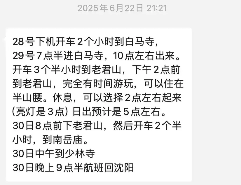 下图是我和我朋友商量的我们这个线路应该怎么走,时间是在6月22,也就是说,到了22号晚上,我自己都才确定我六月初六去南岳庙这个点,那么那女人是如何提前一个月就知道我要去,还明确的知道是两个人,还知道是辽宁人?