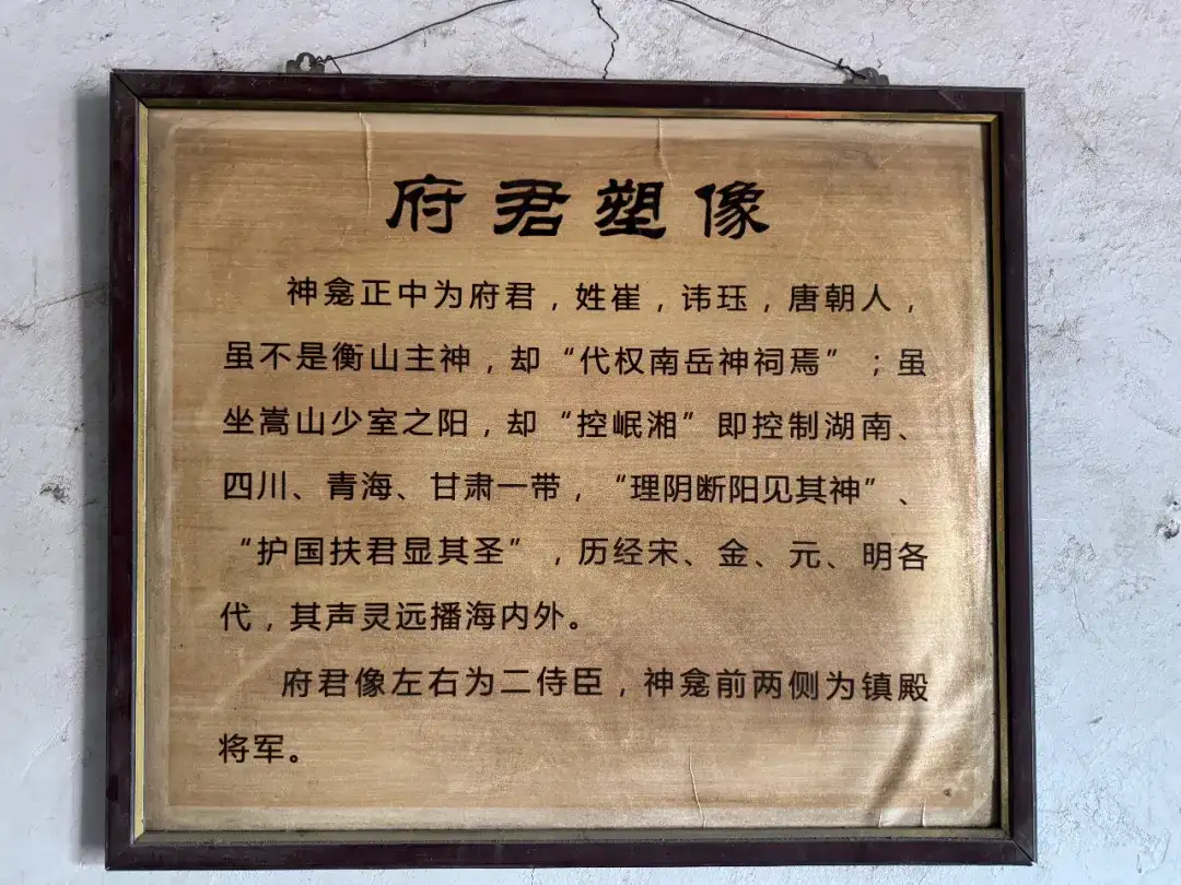 我和大爷定睛瞻仰这位冷门的南岳府君,十二条旒冕高悬,彰显他的帝王级别,可我早先查资料得知,此庙乃是供奉崔府君,我又详细看了介绍牌,上面写着: