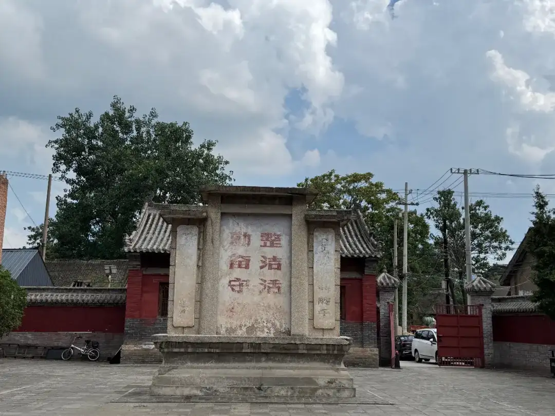 庙里红砖青瓦,构造简单,三进院的格局让人有一种穿越回明清时代的感觉。进门就是五十年代的这种石屏风,上书最为规矩的油漆红字:整洁活X,勤奋守X,后面两个字已经在岁月的洗礼下不得清晰,但这个碑立在这却把五十年代庙产兴学的历史瞬间展现在眼前,耳畔时不时好似回想起那一辈人的孩子们朗朗上口的读书声:我们都是来自五湖四海,为了一个共同的革命目标,走到一起来了!