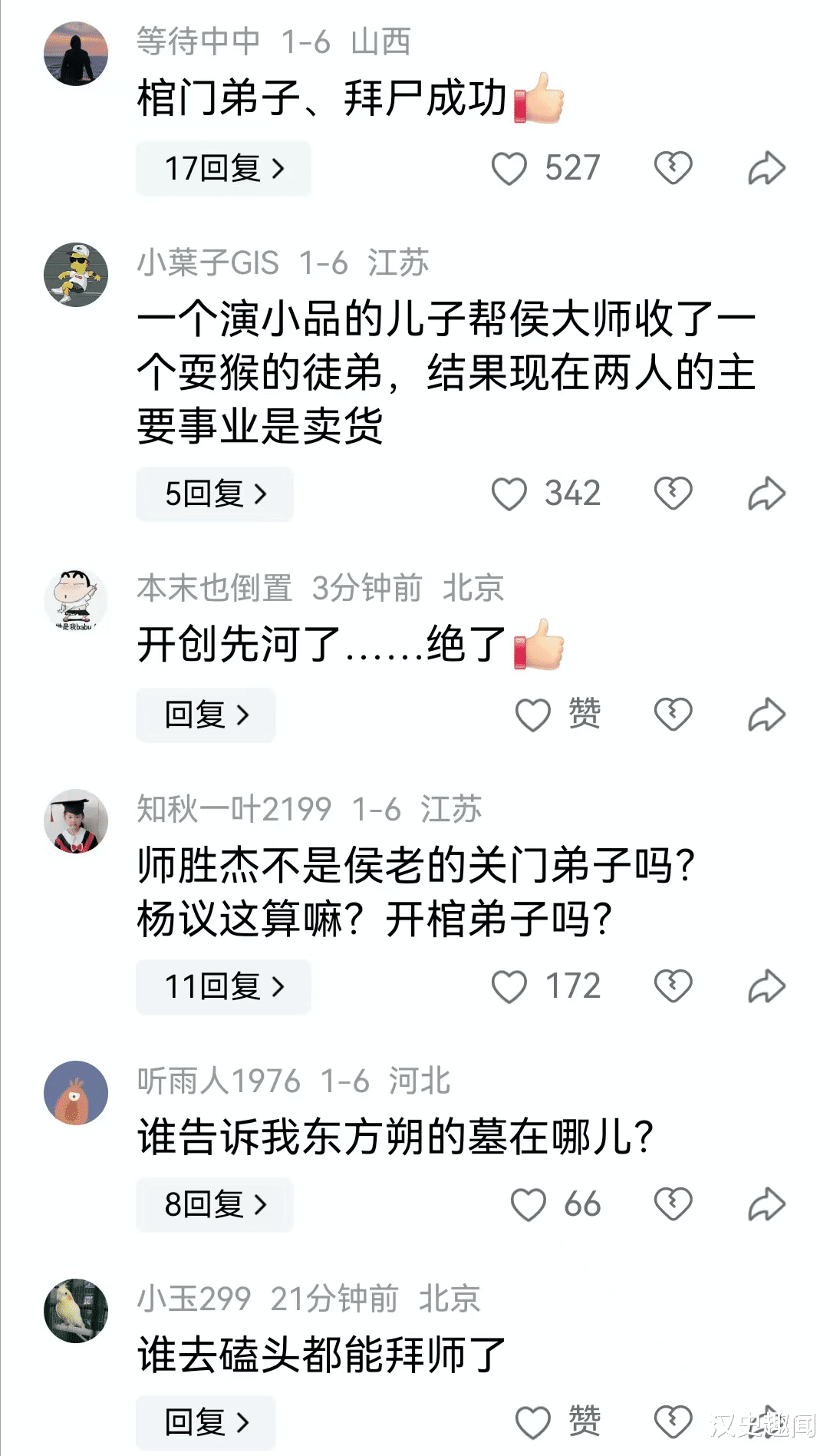 网友对杨议拜师,也是冷嘲热讽,认为杨议是“棺门弟子,拜尸成功”。还认为一个演小品的儿子,帮侯大师收了一个耍猴的徒弟,结果现在两人的主要事业是卖货......