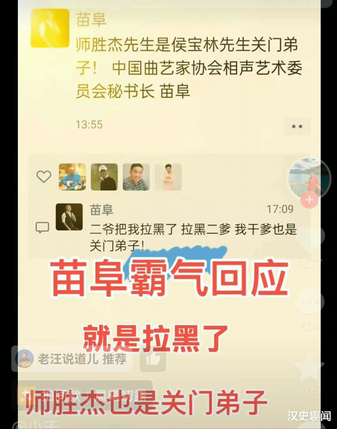 侯耀华看到苗阜的发言很生气,勃然大怒,将苗阜给拉黑了,并且喊话苗阜,说他知道苗阜这个人,但是,苗阜那个中国曲艺家协会相声艺术委员会秘书长的头衔,他觉得很搞笑,这是一个什么组织?他从来没有听说过呀。