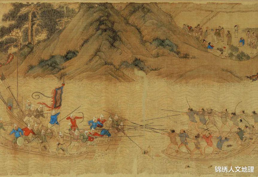 抗倭图卷(局部),截取的画面中,可见平民逃难、倭寇和明军士兵水上激战。图源:东京大学