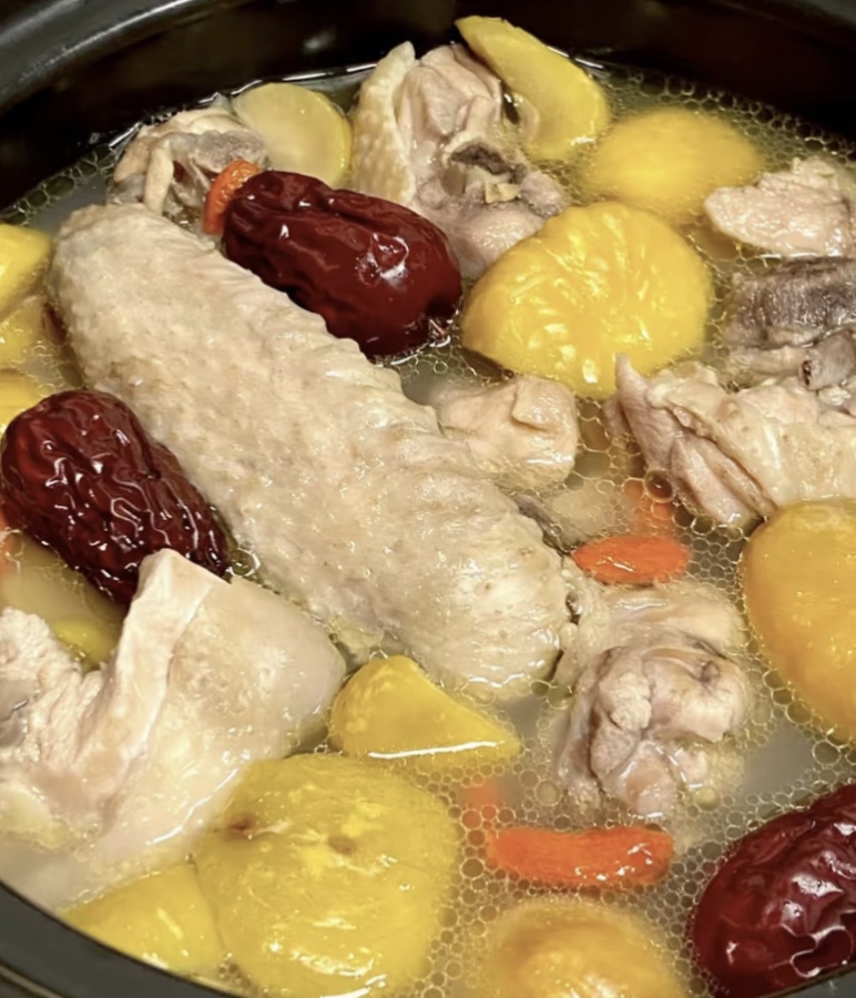 在鸡汤炖煮了约1小时后,加入去壳的板栗、红枣和枸杞。