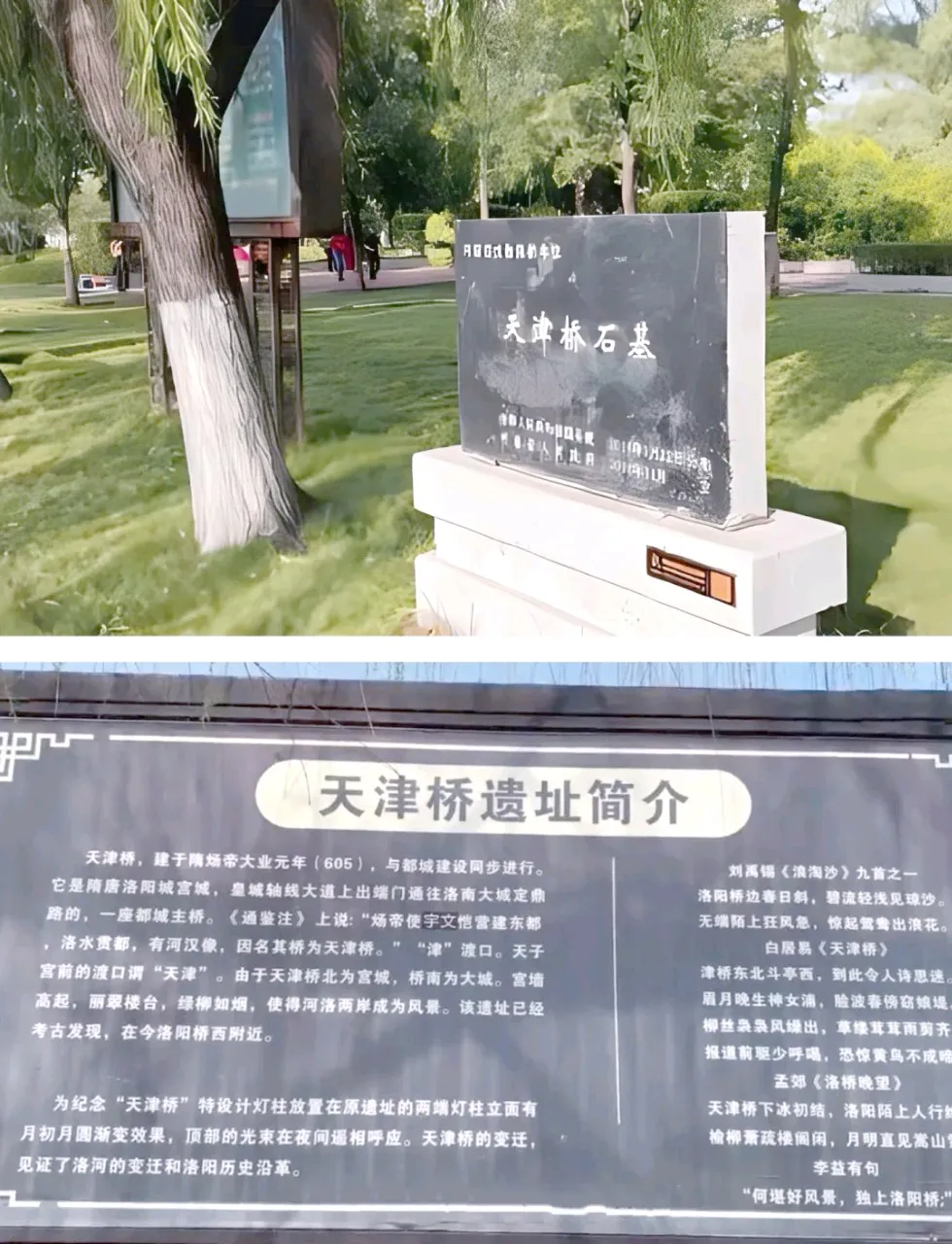 网上流传的是,天津桥位于河南省洛阳市,始建于隋朝大业元年(605年)。最开始为浮桥,后来改建为石桥,是洛阳城南北交通枢纽和“天津晓月”(好美的名字,可惜没用在天津本津身上)所在地。2000年桥的遗址被发现,2025年启动复建项目。