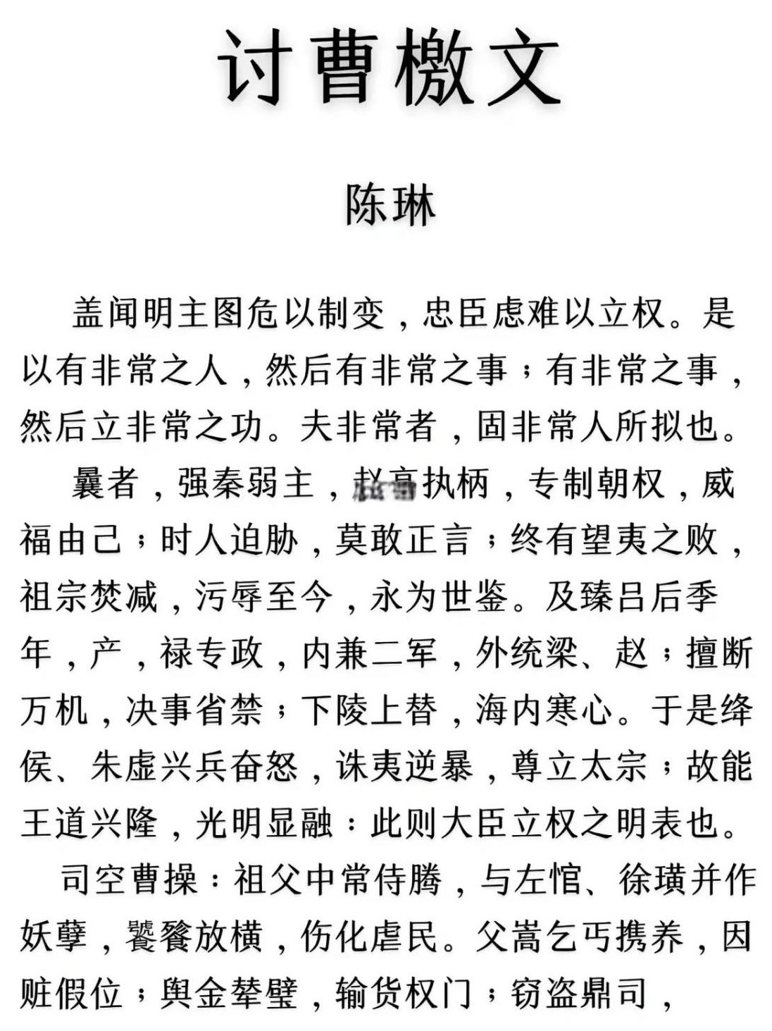 东汉建安四年(公元199年),黄河中下游流域硕果仅存的两大军阀袁绍和曹操终于开始决战。开战前,“四世三公”的袁绍为了出师有名,也为了晓谕各州郡联合反曹,遂命“建安七子”之一的陈琳作檄文昭告天下。陈琳也不负所托,一篇《为袁绍檄豫州》洋洋洒洒1800余字,将曹操骂了个狗血淋头不说,还为袁绍极尽张目之能事。