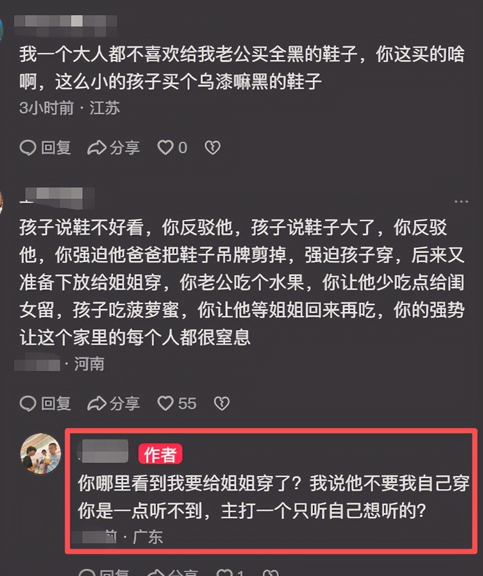 尤其是这位母亲情绪特别急躁,他扔给孩子一双纯黑色的杂牌鞋子,据说是花六十五块钱买的,强迫孩子穿上这个,并且让孩子感谢他的不易。
