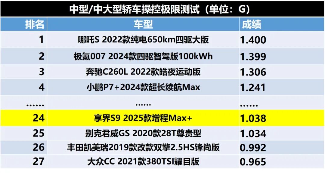 在我们此前完成的中型及中大型轿车操控极限测试数据库中,享界S9的1.038G成绩排名倒数第四,由此见得操控并非其强项。