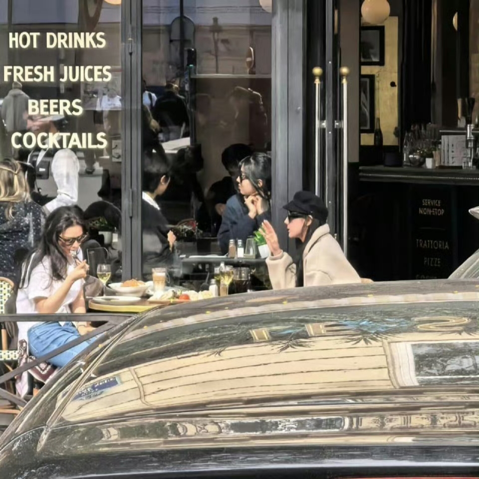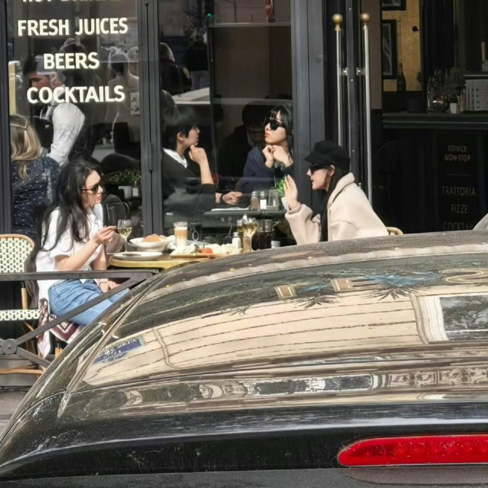 近日,一则关于迪丽热巴与张馨予在巴黎街头餐厅同框的照片悄然在网络上流传开来,迅速点燃了粉丝们的热情。这组照片捕捉了二人在一家有着醒目“HOT DRINKS, FRESH JUICES, BEERS, COCKTAILS”招牌的餐厅户外座位共进午餐的悠闲瞬间。事件起初源于网友“芒果捞小萌主”的偶然发现,几张看似随意的街拍照片,却因为主角是这两位在国内拥有超高人气的女演员而立刻变得不普通。照片中,迪丽热巴身着清爽的白色上衣搭配浅蓝色牛仔裤,长发披肩,墨镜遮面,正专注于面前的美食。而她身旁的张馨予则头戴一顶时尚的黑色礼帽,穿着米白色宽松外套,侧身面向热巴,一只手微微抬起,似乎在分享趣事,两人交谈甚欢,状态极为放松。尽管画面一角有车辆遮挡,但这份不经意间的自然感,反而更显真实,充满了生活气息,背景中隐约可见的其他顾客和明媚的阳光,共同勾勒出一幅闺蜜间惬意午后相聚的温馨画卷。