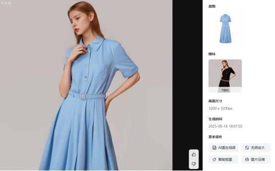 4、生成图片:最后我们只要再点一下“立即生成”的按钮,等待一会儿,我们的 AI 就会帮你自动生成出来啦,而且如果你觉得一件衣服一个一个生成太慢的话,还可以一次性上传多张图片或选择多个模特姿势来批量生成大量的服饰模型图哦!