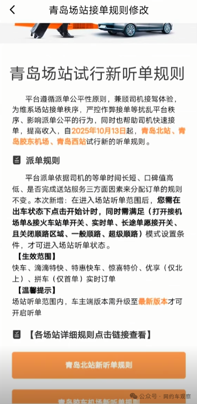 据青岛车友爆料,近日滴滴司机端推送最新消息,为了维护场站接单秩序,严控作弊接单等扰乱平台秩序、影响派单公平的行为,同时也帮助司机快速接单,提高收入,2025年10月13日起,青岛北站、青岛胶东机场、青岛西站试行新的听单规则。